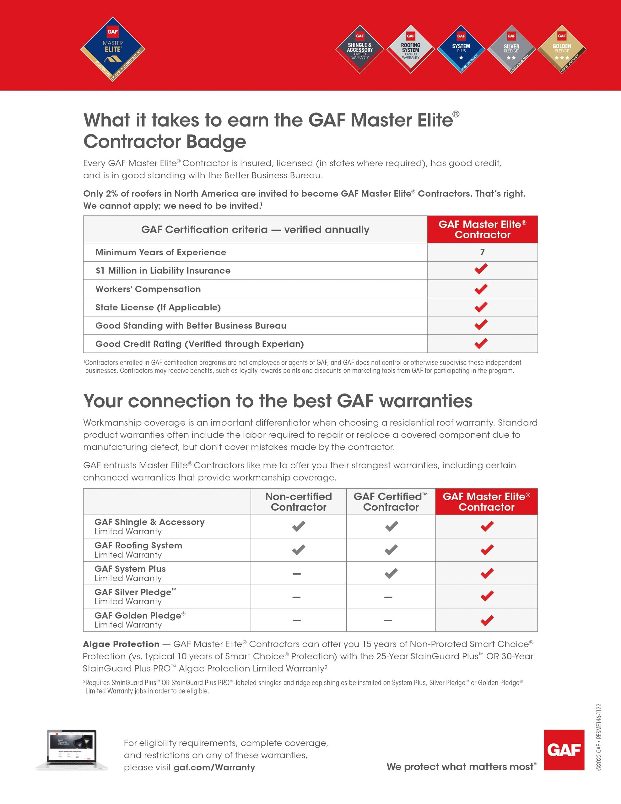 We are a GAF Master Elite Certified Contractor--GAF is the largest roofing manufacturer in the world and they only give Master Elite status to the top 2% of roofing contractors. Therefore, Benjamin Brothers can provide you with a 25-year labor warranty on your roof (20-year for a multi-unit or commercial shingled project) that is backed by GAF and it's transferrable one time to another homeowner--If you have any leaks or problems for 25 years that is caused by an installation error, GAF will pay Benjamin Brothers or another Master Elite contractor to fix it.
